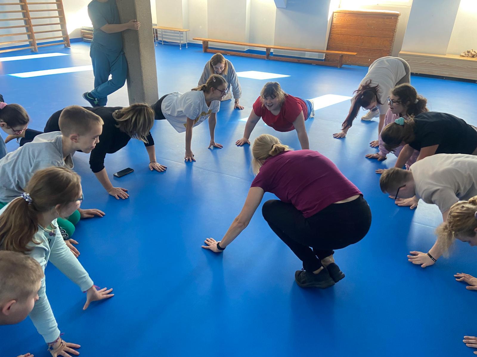 Ciekawym i inspirującym elementem innowacji były zajęcia prowadzone przez panią Annę Skibę. Uczniowie mieli okazję uczestniczyć w spotkaniu pt. „Biegnę jak ninja – lekko i cicho”, podczas którego poznali technikę Slow Joggingu – formy dostępnej dla każdego, poprawiającej kondycję i wspierającej dobre samopoczucie. Kolejne zajęcia pt. „Kręcę jak mistrz – z energią i radością” realizowane były z wykorzystaniem Smovey – specjalnych wibrujących obręczy, które rozwijają koordynację , wzmacniają mięśnie i dostarczają radości z ruchu. Za udział w tych formach wszyscy uczestnicy otrzymali, od prowadzącej zajęcia, certyfikaty za aktywny udział.